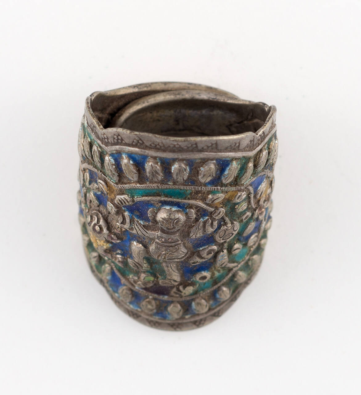 DescriptionSilver ring with blue and green enamel. Figures of a child, fish and flowers, with a scalloped edge.