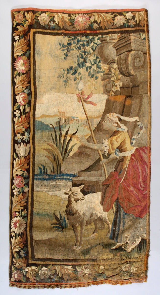 DescriptionHand-woven with figure of woman in red drapery, three children with fire pot. Green foliage. Border and fringe. Lined with gold velvet.Provenance