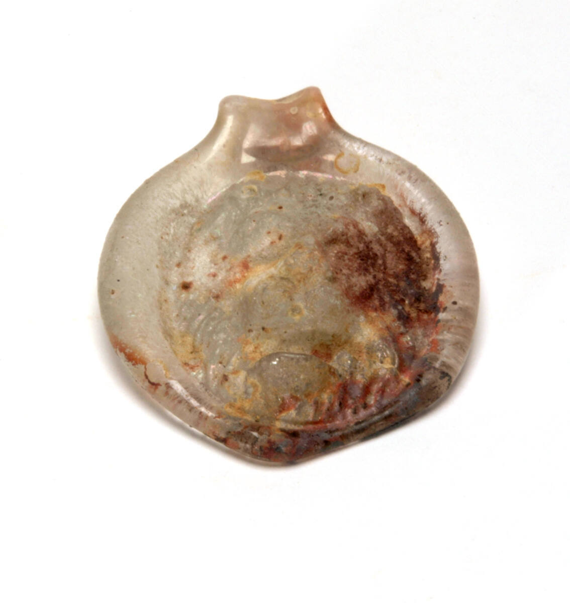 DescriptionA circular piece of glass with a hanging loop on the top edge. A frontal view of a male lion's head has been press molded onto the front of the pendant while the back surface has been left undecorated. The glass is whitish with a weathering crust in various colors (yellow, red, orange and reddish-black) partially covering the surface.
