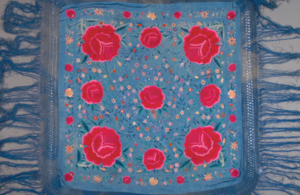 DescriptionSlightly faded medium blue satin ground, embroidered in multi-colored silk twist with a large central peony surrounded by smaller peony blossom on an embroidered floral field; and whole provided with long gringe of blue silk twist.