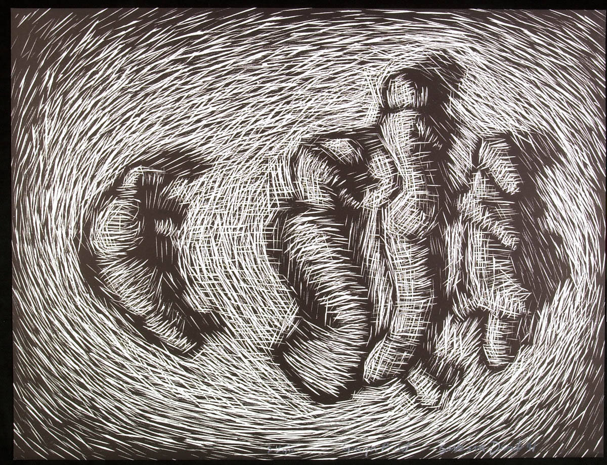 DescriptionWhite scratches against a black background that reveals four anthropomorphic figures.Copyright© Barbara Duval