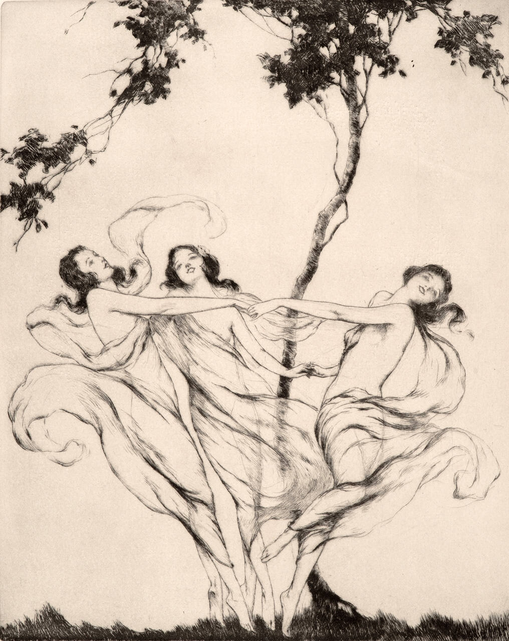 Gallery LabelEvery element in Warren Davis’ etching epitomizes the carefree attitude synonymous with the word frolic. His delicate, wispy lines convey breezy, uninhibited movement. The three women balance on their toes, immune to such mundane realities as gravity. Their hair and gauzy clothing enhance this effect of joyful weightlessness, swirling about them in graceful arabesques. Even the tree in front of which the maidens blithely dance sways back and forth.