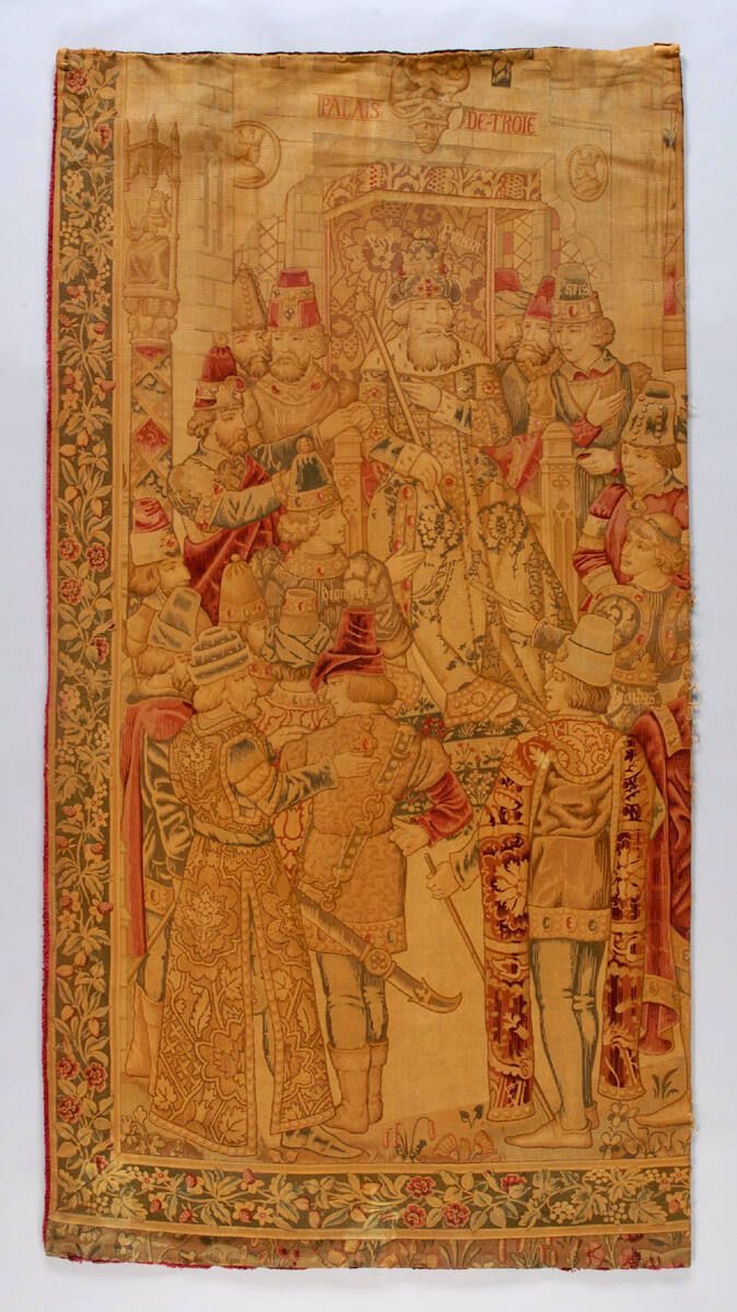 DescriptionMachine woven was formerly one piece but has been cut in the middle. Figures of soldiers with flower border and lined with rose velvet.Provenance