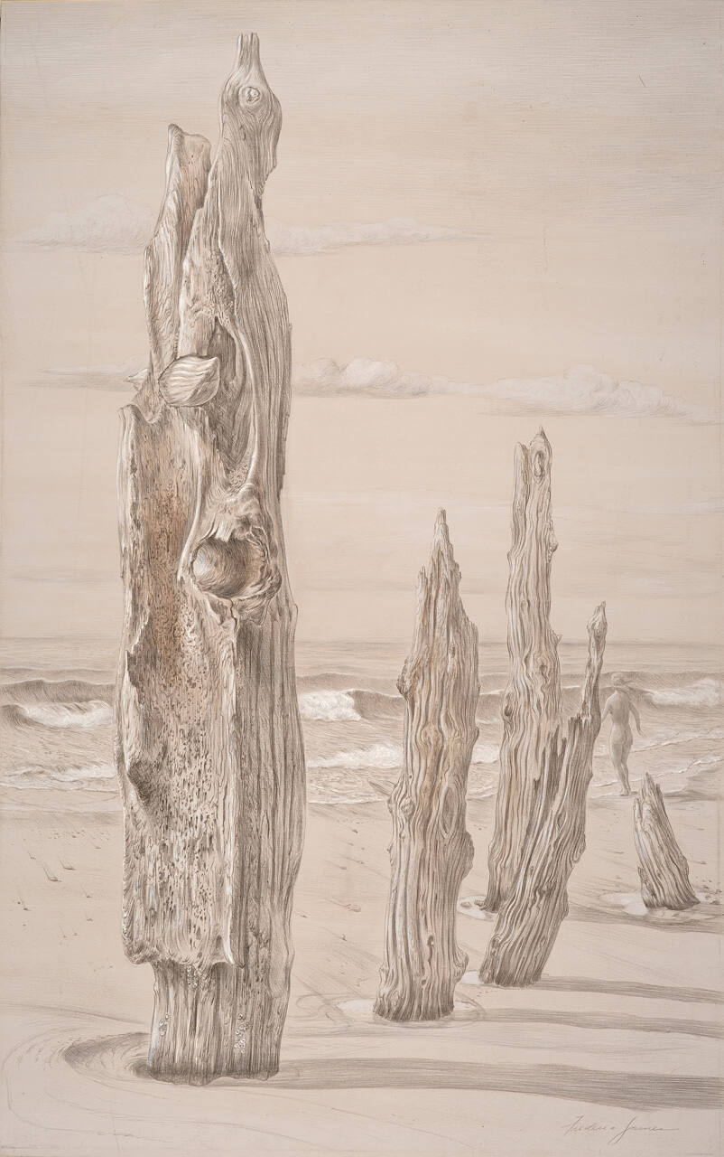 Gallery LabelLook closely and you will see Venus as she walks back toward the waves, past weathered driftwood standing in the sand like the broken columns of ancient ruins. According to ancient Roman myth, the sea birthed Venus, the goddess of love and beauty, as a full-grown woman. Rather than recreate her briny origin story as countless other artists have, Frederic James invented a new narrative in which Venus returns to her birthplace. Without the descriptive title, however, we might overlook the diminutive figure.