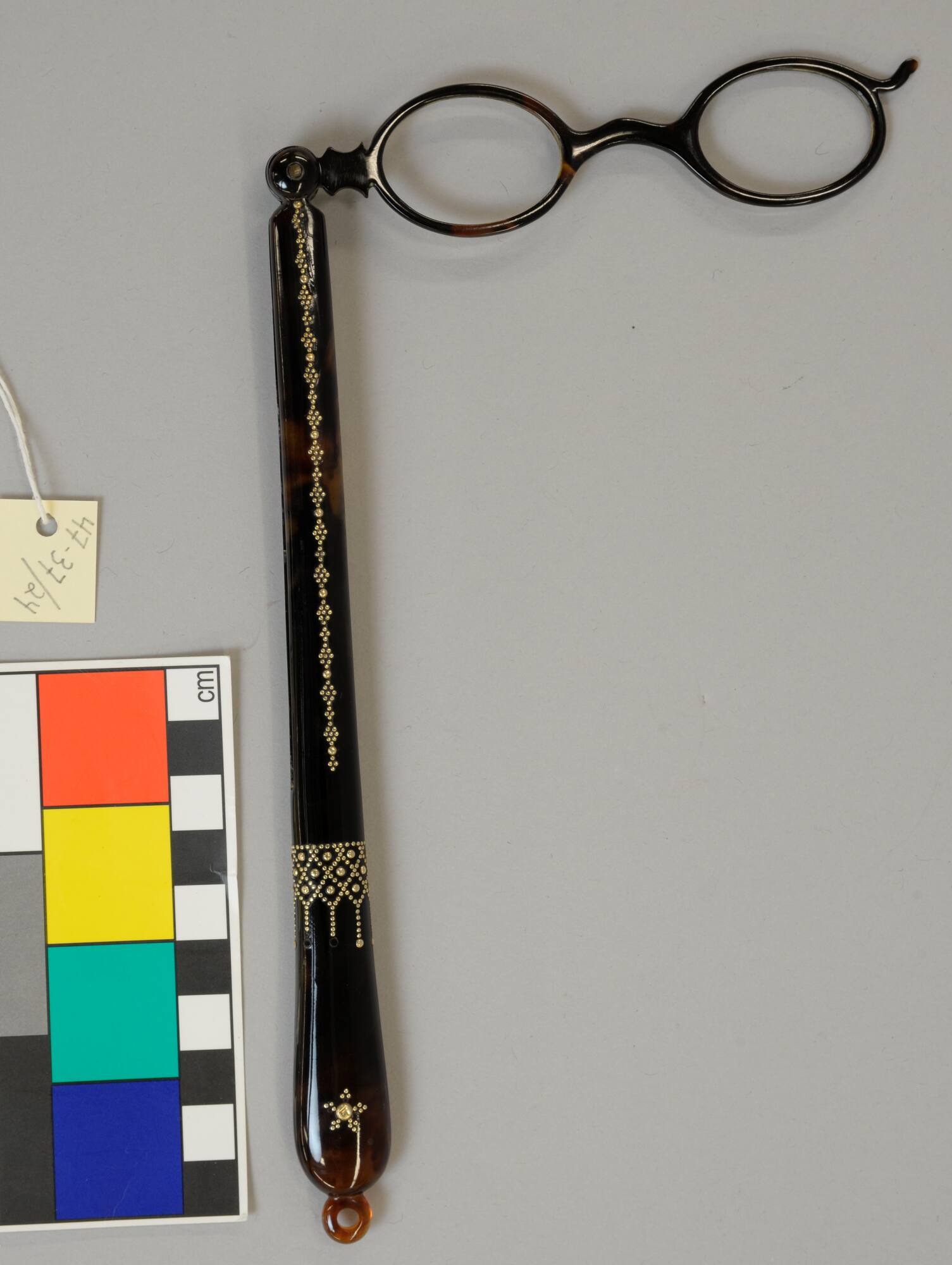 DescriptionTortoise shell lorgnette, slender glasses, handle decorated with gold inlay in dots.