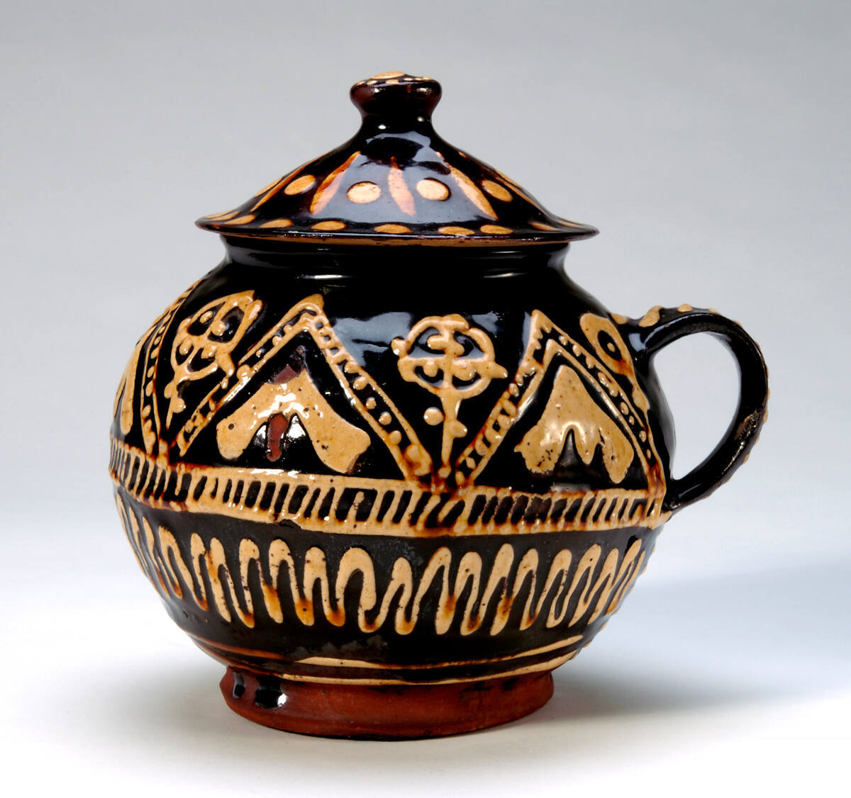 DescriptionRound red clay jar with loop handle; four register design in cream on brown: Bottom two lines; next-to-bottom, continuous wavy line; next-to-top, two lines with parallel diagonal lines in between; top, alternating triangular and round shapes with added dots and lines. White clay lid, similar but not matching, with one row of dots on outside and row of alternating dots and lines on inside. Also dots on knob.
