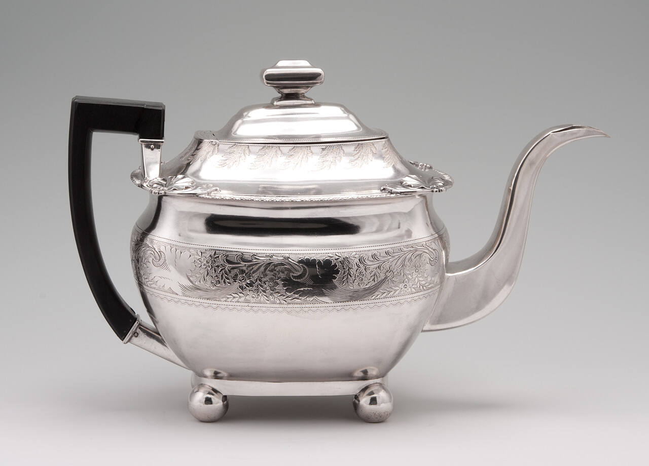 DescriptionRectangular boat-shaped body, curved and tapered sides, stands on four ball-shaped feet. Curved spout is rectangular in cross section. Hinged rectangular cover is domes, with rectangular finial. Continuous frieze of bright-cut floral engraving on shoulder. Concave area just below the cover is gadrooned and bears applied shell embellishments on its corners. At top is chased with a repeating foliate leaf motif. Wood handle, possible ebony.