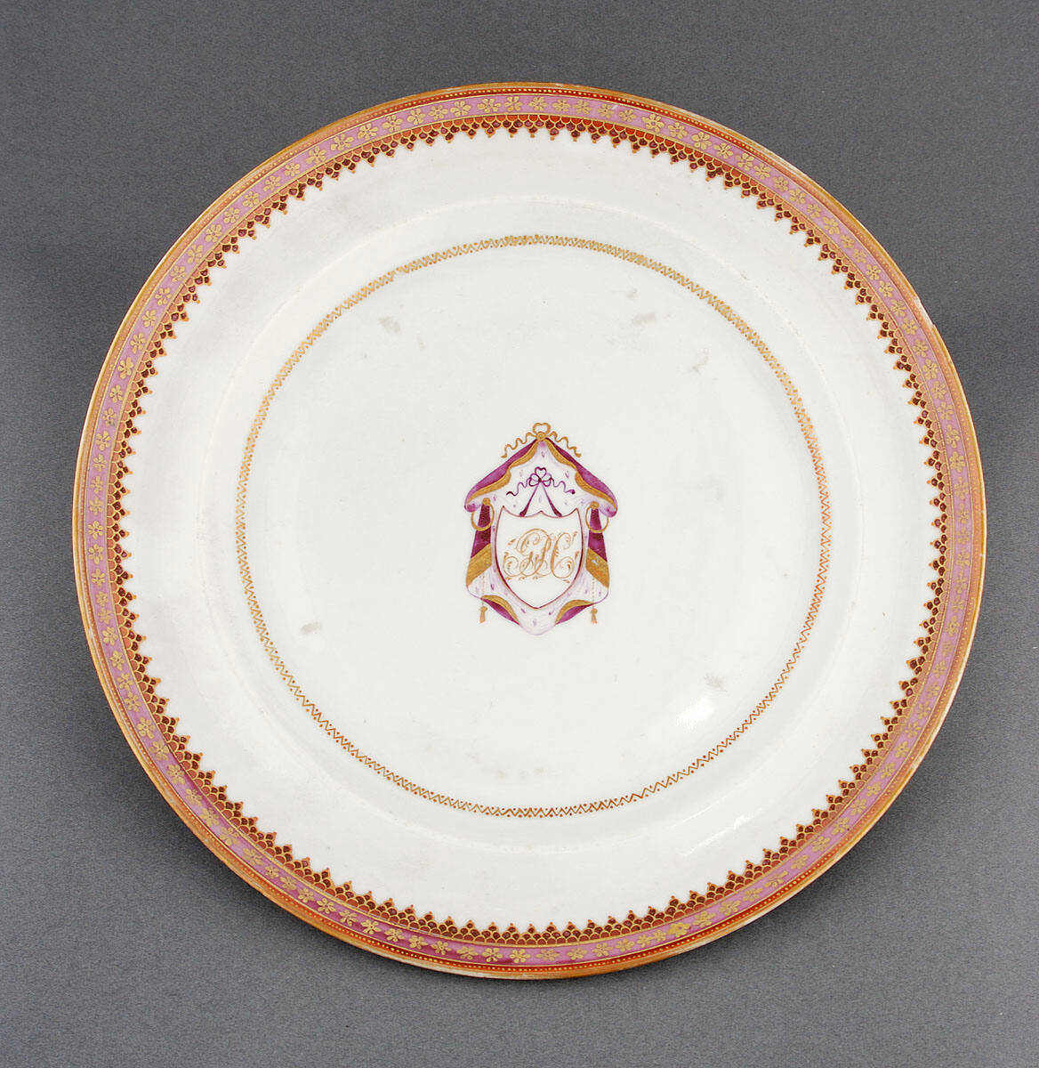 DescriptionNarrow borders in pink, red, and gold. Initials G.P.C. within shield.