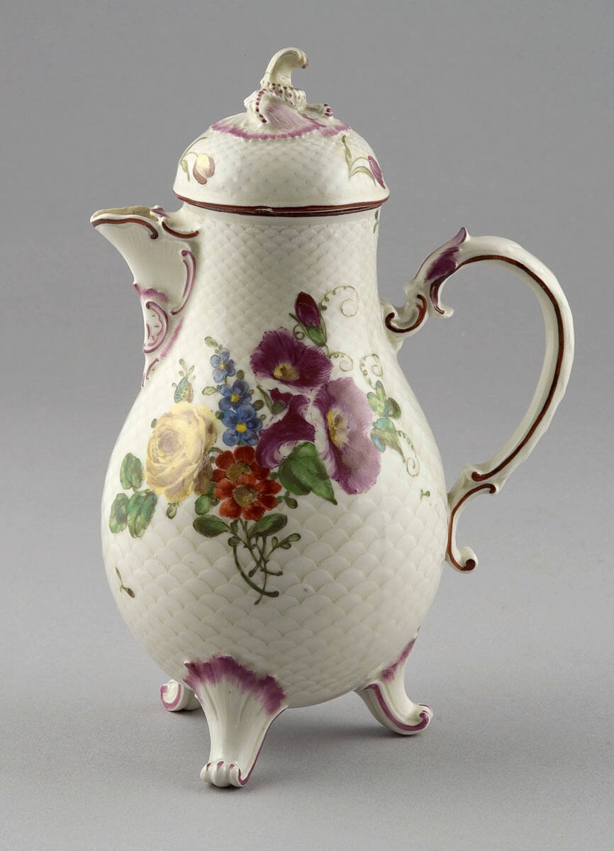 DescriptionPear-shaped body with molded scales, three curved feet, molded S-curved handle, outwarding curving lip; hemispherical lid surmounted by curved knop; decorated with flowers in purple, red, blue, green, and yellow enamels.