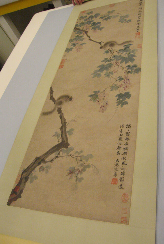 Grapes, a valuable fruit in ancient China, were the favorite subjects of Yue Zheng, who painted in addition to his career as a court official. Yue chose them, according to one of his treatises, due to their slender trunks, rich green leaves, curvy veins and juicy purplish berries. Using a conventional analogy in Chinese painting, the artist equated these good qualities to gentlemen's virtues. Likewise, squirrels were the elegant substitute for mice, and suggested abundance and proliferation. Chinese painters loved to use bunches of short lines over the layer of ink wash to create the texture of squirrels' soft, fluffy fur.