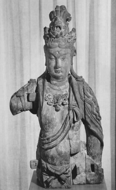 DescriptionFragmentary sculpture of Kuan-Yin, legs and right arm missing. High headdress bearing an image of Buddha. Scarves cover the shoulders and are draped across the chest. Originally the figure was seated in the maharajalila pose, the arm resting on the knee of the upraised right leg, and the left leg pendant. The wood is weathered to a rich brown.