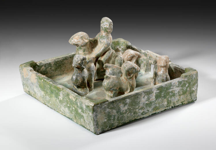 DescriptionIridescent green glazed pottery. Four rams in an enclosed pen, attended by a man on horseback.Gallery LabelSheep were not as widely raised in China as were pigs-even today many Chinese will not eat mutton or lamb-so these sheep were probably raised for their wool. The shepherd has mounted one of his sheep to survey his herd.