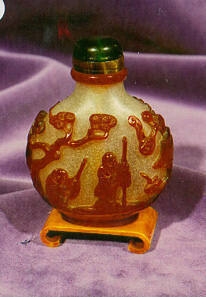 DescriptionFlattened peach-shaped Peking camphor glass bottle overlaid with red glass design of sages underneath a pine tree among rocky mountains, green glass stopper.