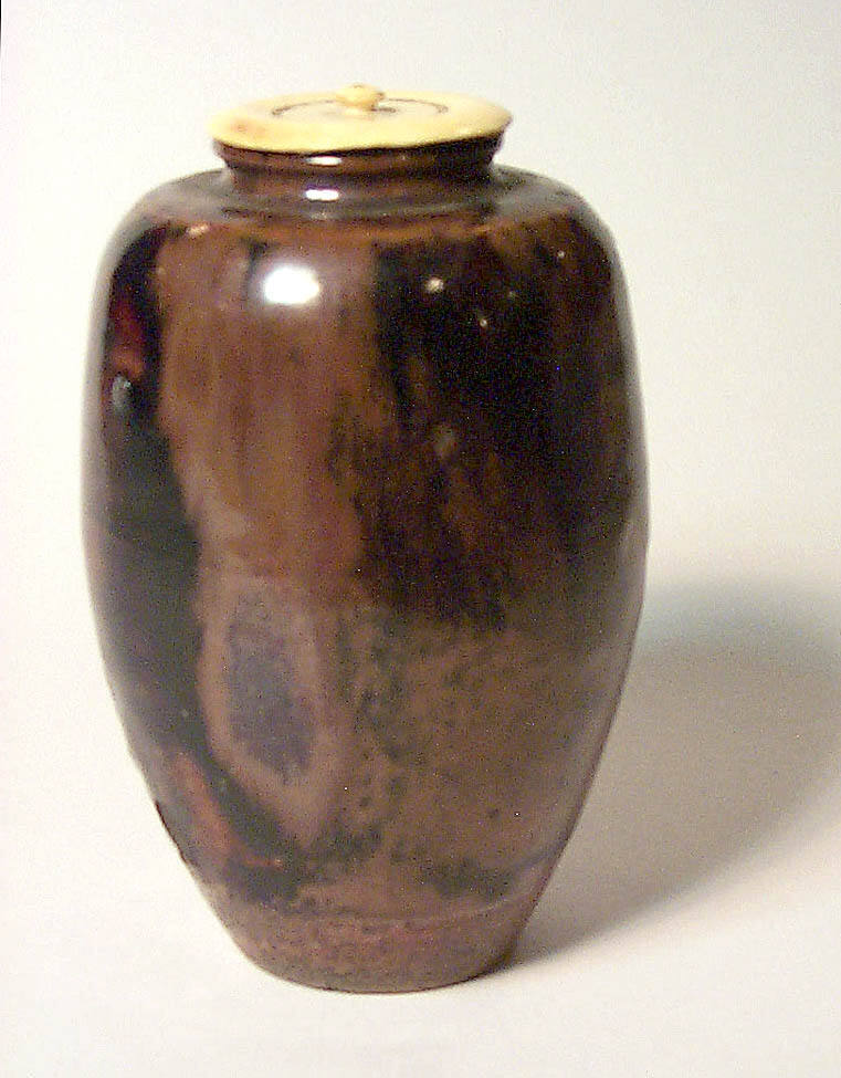 DescriptionA tea caddy of ochre clay with incised lines on the body and a reddish brown underglaze with dark brown splashes. With a lid