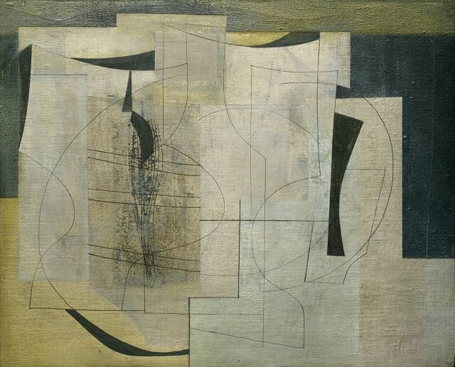 DescriptionThinly painted semi-abstract compostition of flat, rectilinear gray, black, white, and yellow planes with superimposed black lines in curved and straight contours, one, center, forming a bottle shape.Gallery Label1954 (winter: white Seal) is an example of Ben Nicholson's Cubist-inspired landscape paintings in which overlapping planes and forms are suggested by simple lines of contour. The resultant space is shallow, precisely defined and subtly balanced. Thin layers of paint have been gently abraded to accentuate the surface texture and further emphasize the shallow space. Together with his choice of a monochromatic palette, these elements evoke the taut spareness of the season and the place where the work was painted.