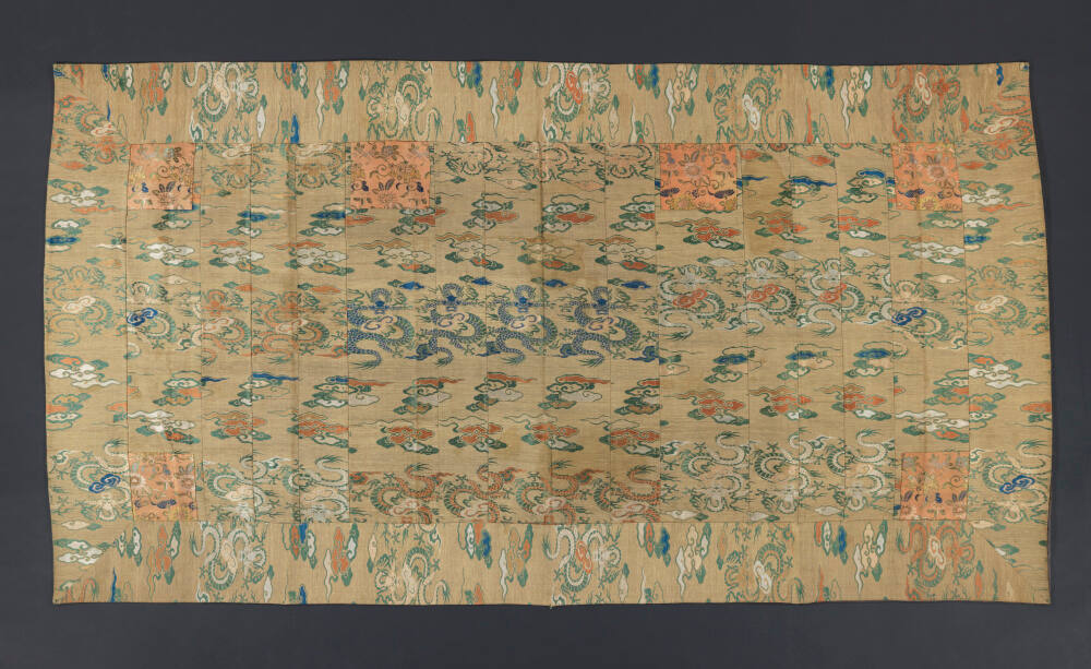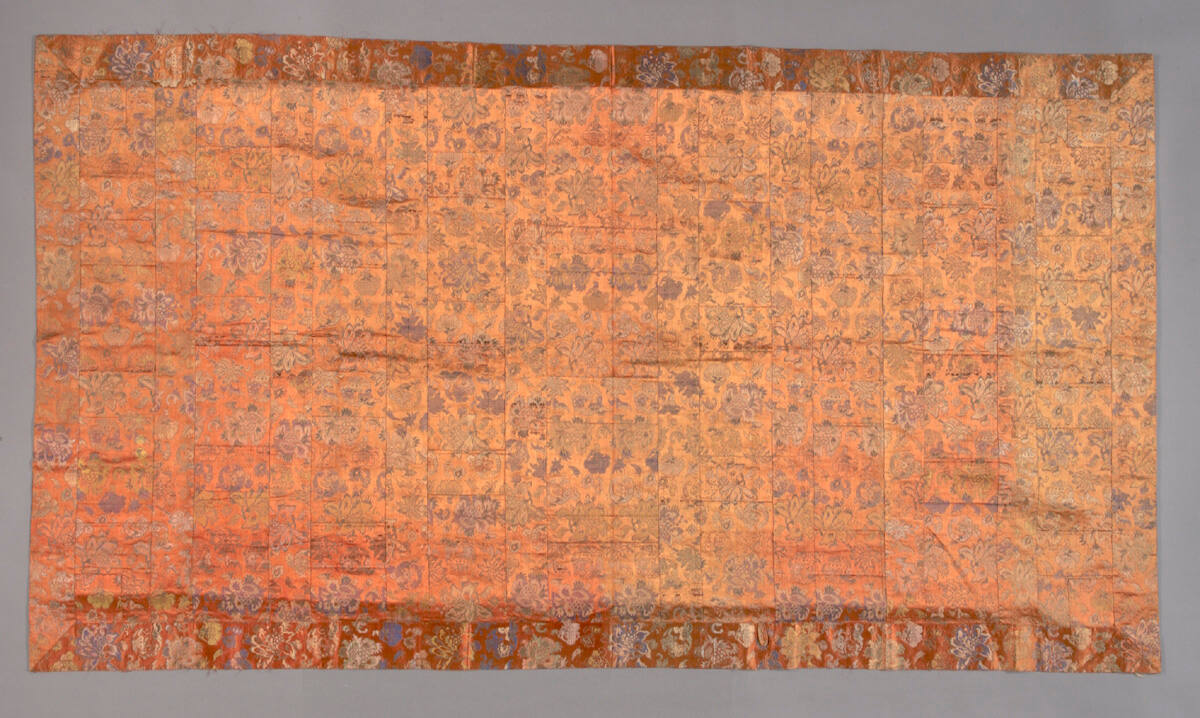 MediumChinese tan silk brocade gound with purple Japanese kaki (iridescent) silk brocade backing