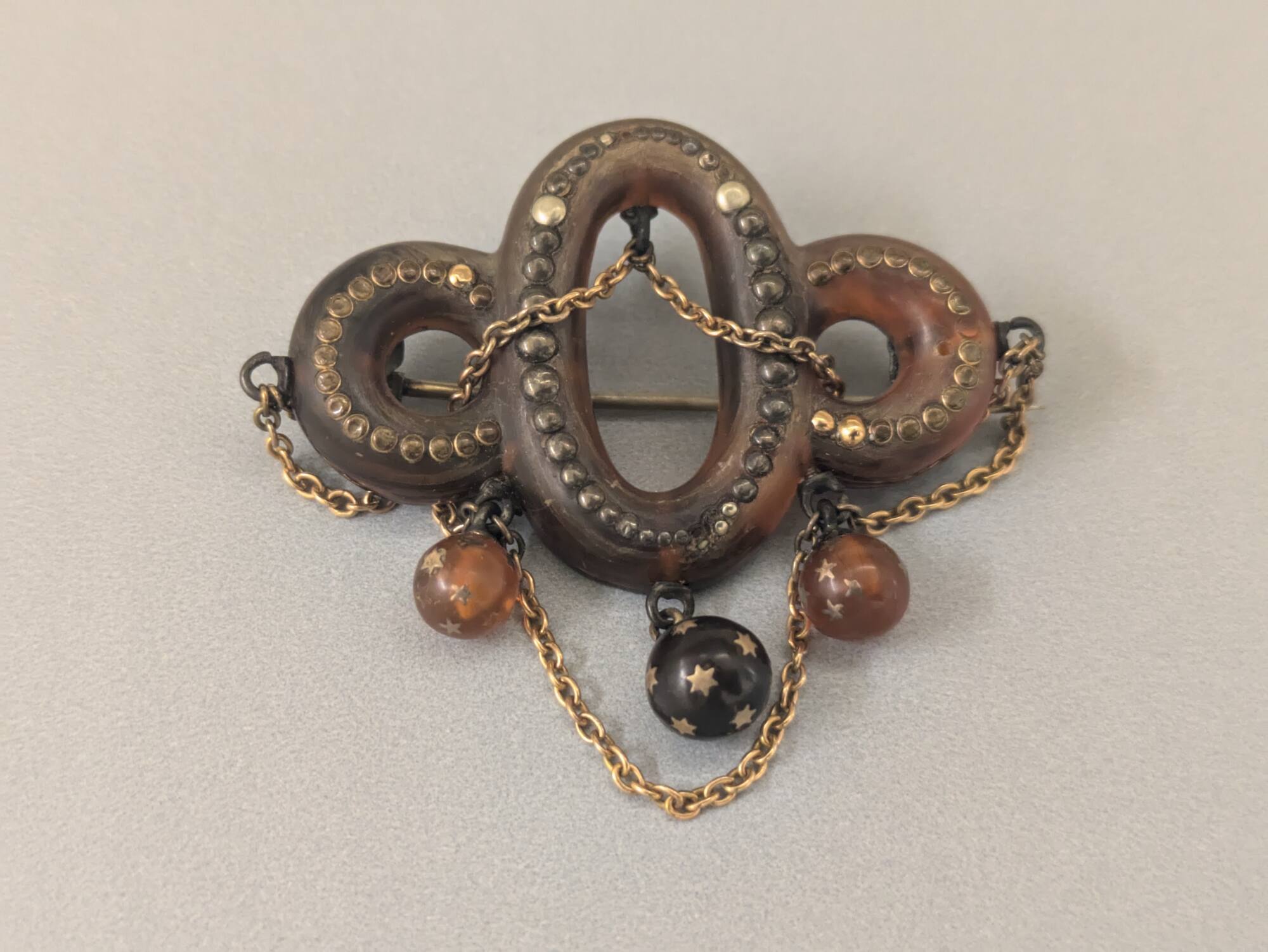 DescriptionOval piece of tortoise shell with circles on each side. Gold inlay dots. Three star covered balls as pendants.
