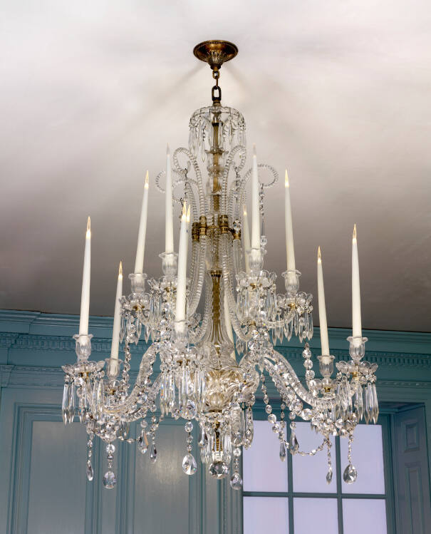 DescriptionSix S-curved branches bearing candle-holders, emerging from central basket surmounted by central column bearing cuplike element to which are attached five arms, in S-curve, each bearing candle-holder at bottom, pendant prism from top. Column continues above and supports dishlike capital. Candle-holder, all with bobeches and pendant prisms, are connected by swags. Large ball pendant beneath center. Each of six lower arms has pendant midway.ProvenanceWith Ginsburg & Levy, Inc., New York, by 1933;