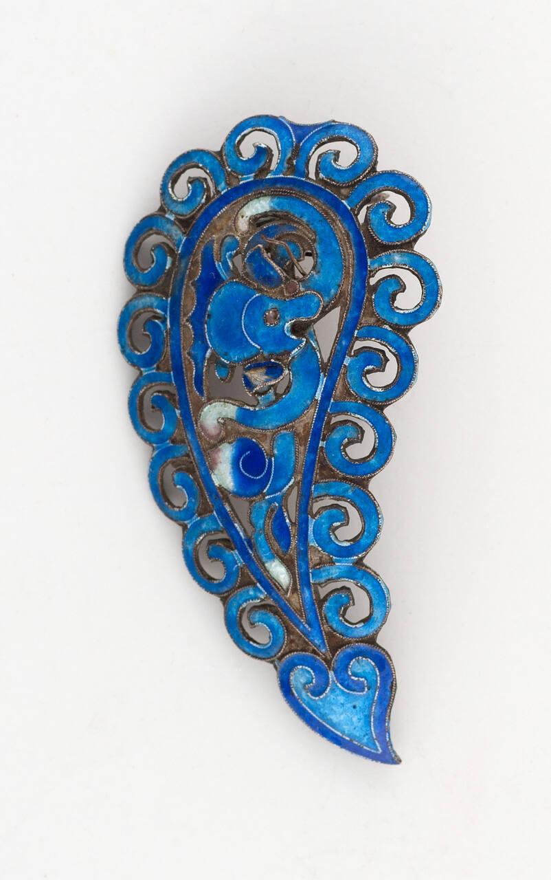 DescriptionBlue and green enamel on silver. Small leaf-shaped hair ornament on pin.