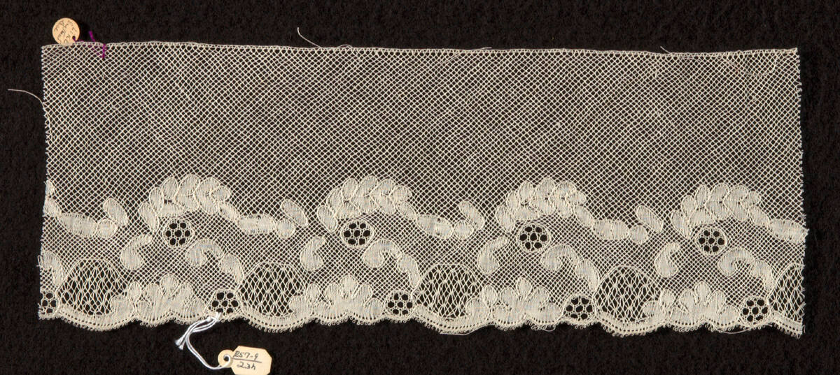 DescriptionBobbin-made straight lace with a square mesh ground of twisted threads. The pattern is in whole stitch, with a glossy outlining thread and fillings of honeycomb and spider meshes.
