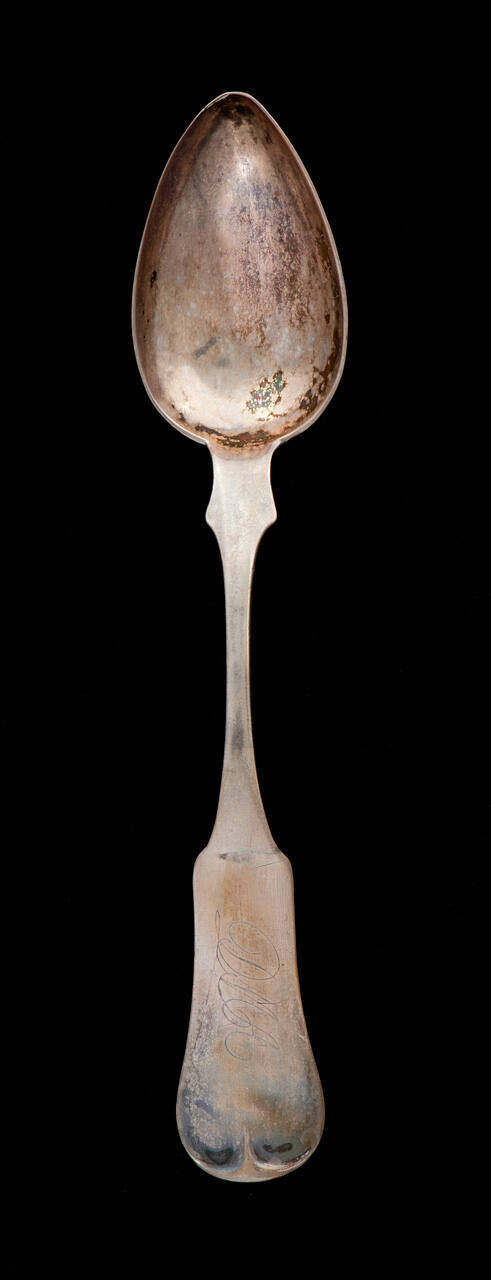 DescriptionLarge silver serving spoon. Fiddle pattern. Engraved with initials in script D.M.A.