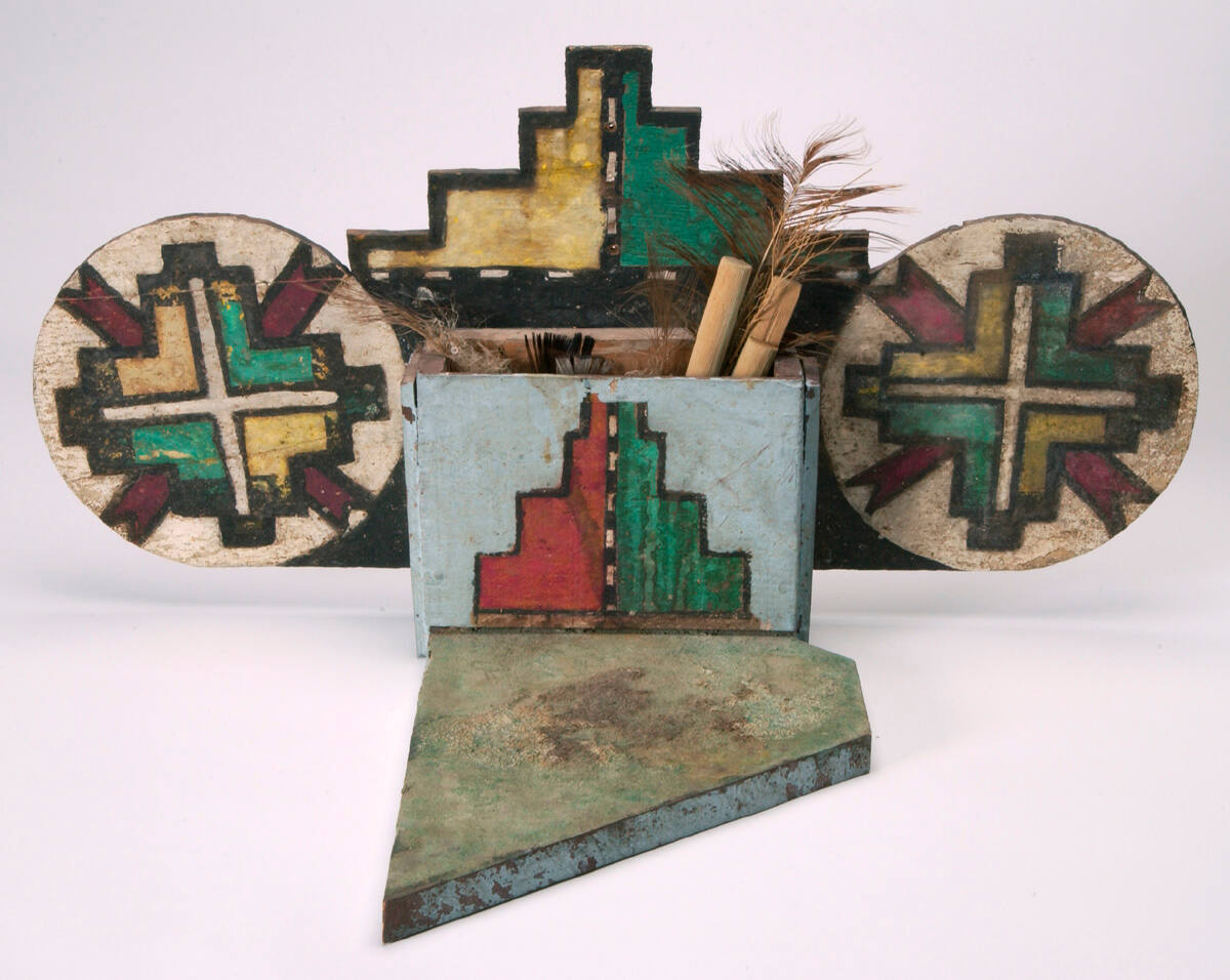 DescriptionA container for pahos (prayer sticks), the central portion a rectangular box painted white with a cloud ladder in black, blue, and red painted on the front, the rear panel of the box rising above and cut in the form of a cloud ladder painted in white, blue, and black, on each side of the box, a circle of wood painted white upon which is painted a device of four cloud ladders arranged to form a cross, another cress formed of black-outlined red arms, a number of pahos made of wood with feathers attached placed in the box.