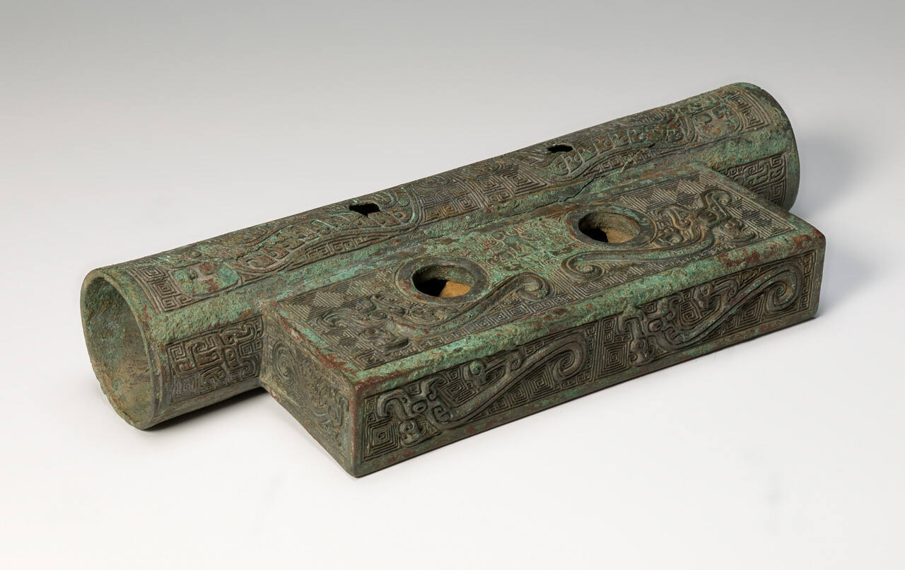 DescriptionPole decoration for a chariot decorated in raised and incised formal patterns of dragons, "Chou hooks," Tao T'ieh mask, thunder patterns, and diamond patterns, green and red patina.ProvenanceT'ang Hsiao Wu, Peiping (modern-day Beijing), China, by March 30, 1934;