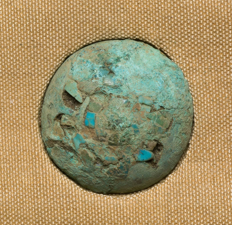 DescriptionOne of twenty-one bronze chariot ornaments, with a green patina.Provenance