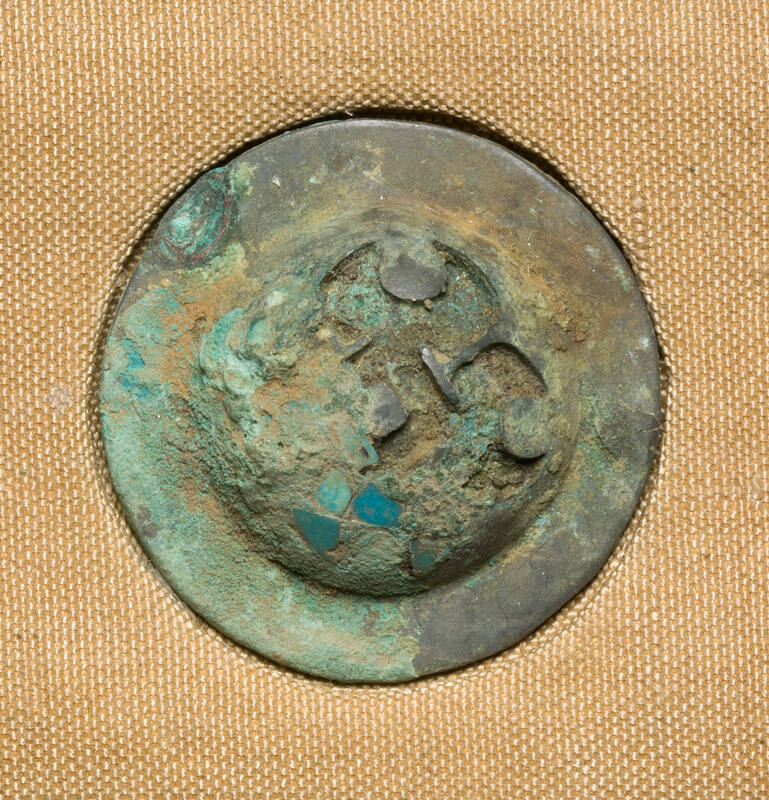 DescriptionOne of twenty-one bronze chariot ornaments, with a green patina.Provenance