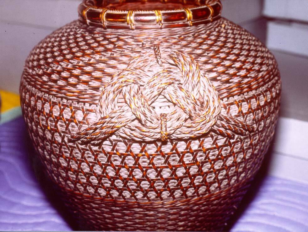 DescriptionOvoid shape having a high shoulder, with the plaiting in four friezes atop a multi-ringed split bamboo foot and terminating in a wrapped and rolled bamboo mouth, with the shoulders decorated with tightly braided and plaited Buddhist knots; the whole stained and finished to a typical dark brown.