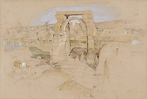 John Frederick Lewis painted this panoramic view of ruins, with meticulously inscribed hieroglyphics and palm trees, for a British audience. At the time, Egypt was under French colonial rule and images like this contributed to a popular European narrative of an exotic and fantastical Middle East.