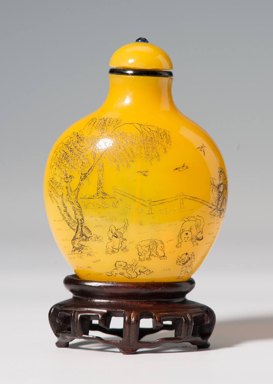 DescriptionOf large, bulbous form, the translucent metal of bright yellow color, the front incised with five boys performing somersaults in a garden setting beneath a willow tree, highlighted in black, the reverse with a forty-seven-character inscription.