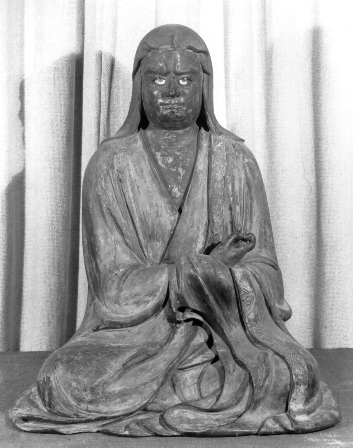 MediumBlack lacquered wood with traces of red paint and gilding with glass eyes