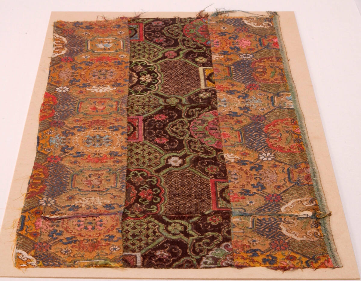DescriptionThree fragments sewn together. Center one dark purple brocaded in red, green and gold. Other two of tan, brocaded in red, blue, green and gold. Designs on all three conventionalized flowers in formal arrangements.