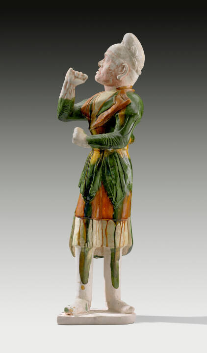 DescriptionA pottery figure of a groom wearing a green coat with amber revers over an amber and cream underskirt. His hair is arranged in two coils, tied in the front with a bow. The head, face, hands, legs, and feet unglazed.ProvenanceBraganza Investments, Ltd.;
