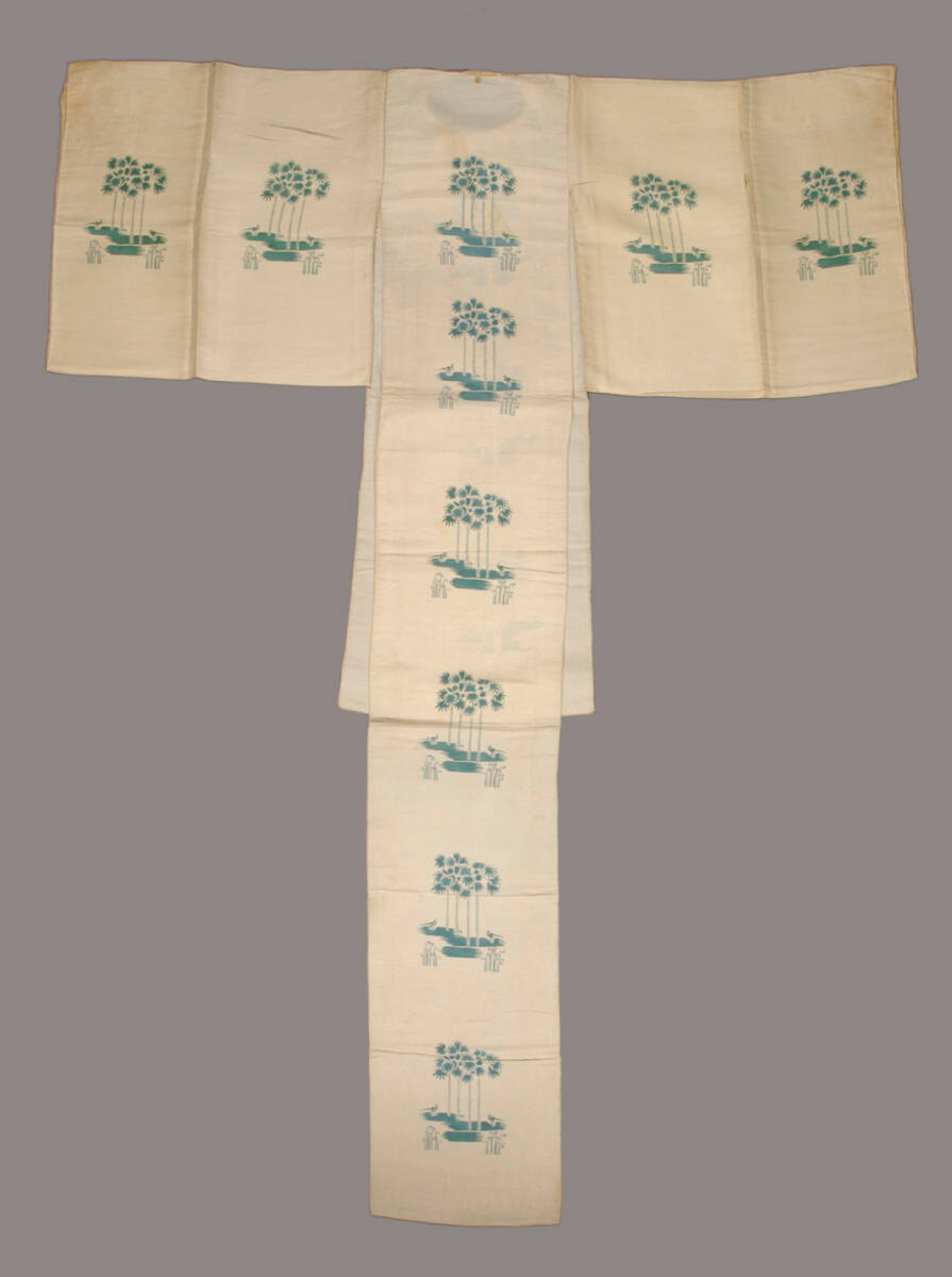 DescriptionWhite silk ground with stencil dyeing and black and red rope (akahime) at neck, symbol of the ceremony. Design of pheasants, paulownia, and bamboo.