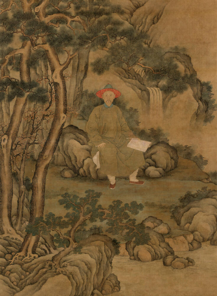 The Qianglong Emperor was noted for dressing as various professionals. In the painting here, a young scholar poses in the woods. He wears a fancy hat and casual robe and holds a blank book. In contrast, the sculpture features a middle-aged Buddhist priest carrying prayer beads. Both figures may represent the emperor, or were created after the style of his informal portraits.