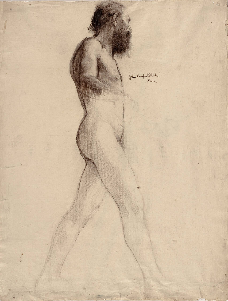 DescriptionThis large charcoal drawing depicts a nude man viewed in profile. The man strides parallel to the picture plane moving toward the right with his proper right leg extended and proper right arm slightly bent at the elbow. His curly hair; bushy beard; and the musculature of his shoulders, upper right arm, and chest are rendered in great detail, whereas the remainder of his body is only suggested through a light outline and very minimal shading. The artist's signature and the inscription "Paris" are prominent--just to the right of the model's chest in the upper third of the composition.
