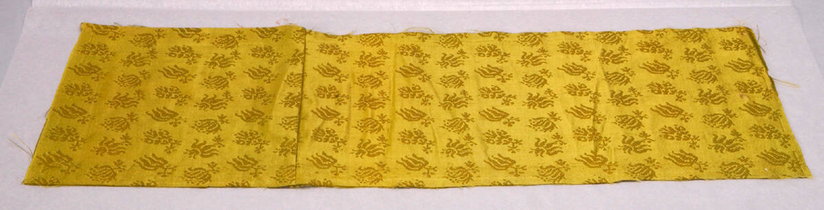 DescriptionYellow green background, all over design of conventionalized flower and flame in old gold silk.