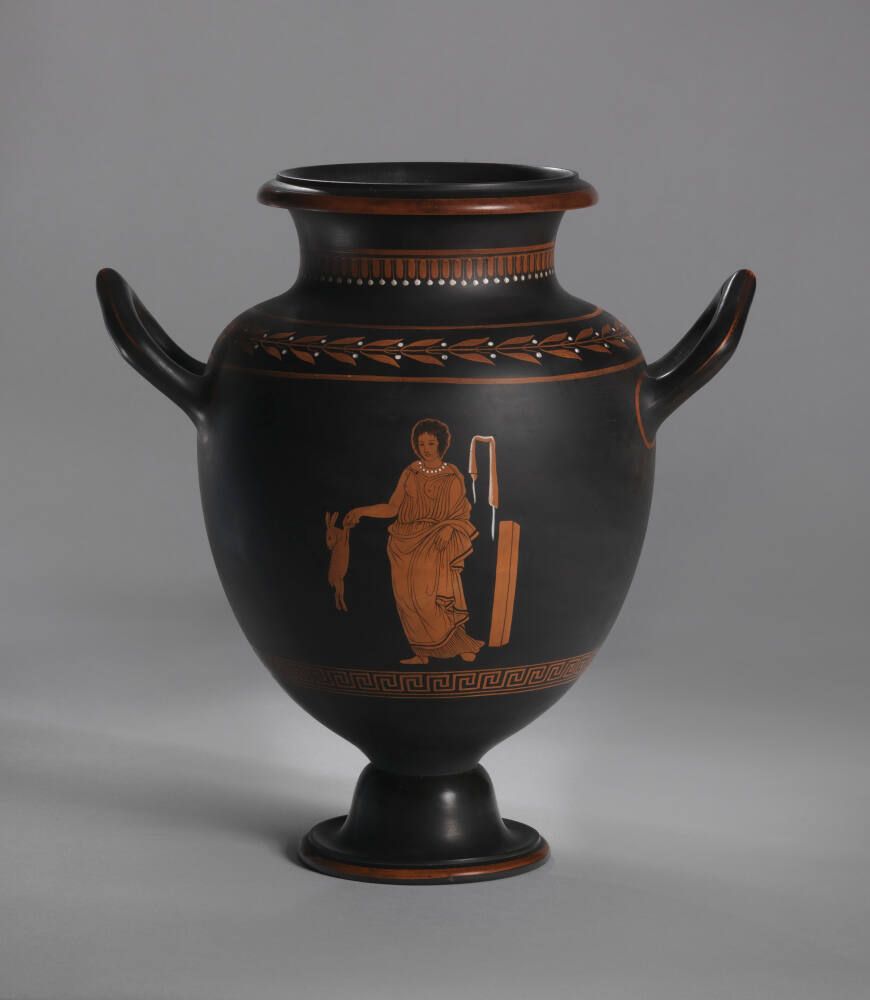 Gallery LabelThe black stoneware and what Wedgwood called "encaustic" (pigment mixed with wax) decorations of this vase were inspired by the red figure decoration on black ground ceramics of ancient Greece. In fact, Wedgwood's decoration was enamel and slip (liquid clay).