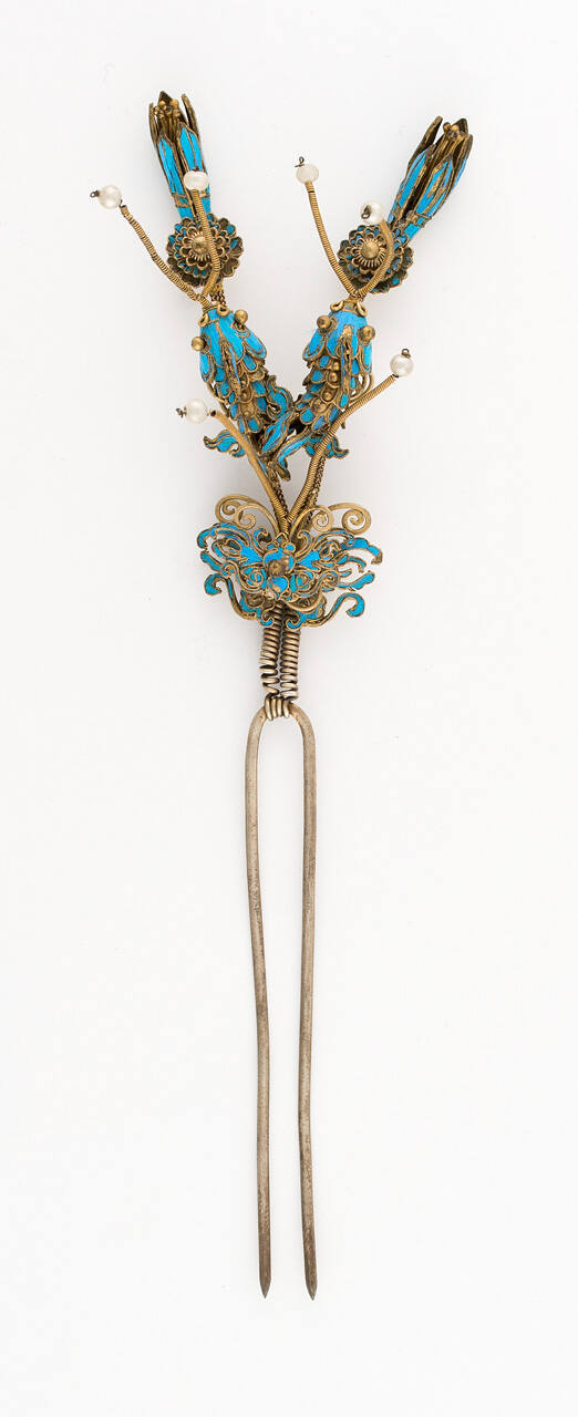 DescriptionBlue enameled butterfly, two fish and two rosettes with pods on two silver gilt chain foundations.Exhibition HistoryManchu Court Art, Stanford (CA) University Museum, mid-November 1954-February 6, 1955.