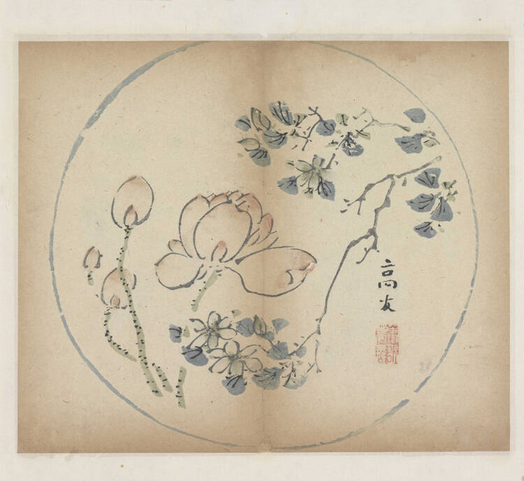 DescriptionCircular print with several magnolia blossoms and a branch with cherry blossoms, in browns, greens, and blue.