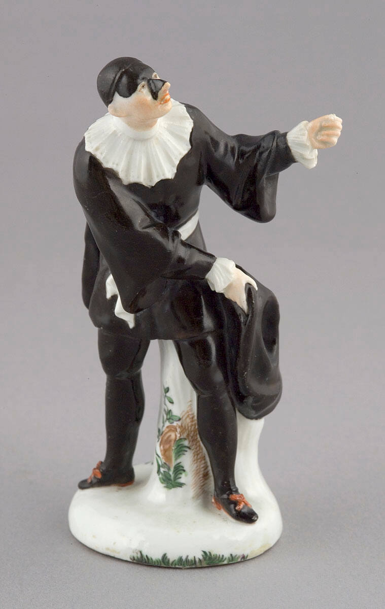 DescriptionItalian Comedy figure, the Doctor: standing figure gestures with upraised left hand, right hand sweeps to left holding black, tricorne hat; clad in black skull cap, mask, wide, white collar with scalloped edge, black suit with wide sleeves and close-fitting pants, white belt, black shoes, leans against white tree trunk with floral decoration.