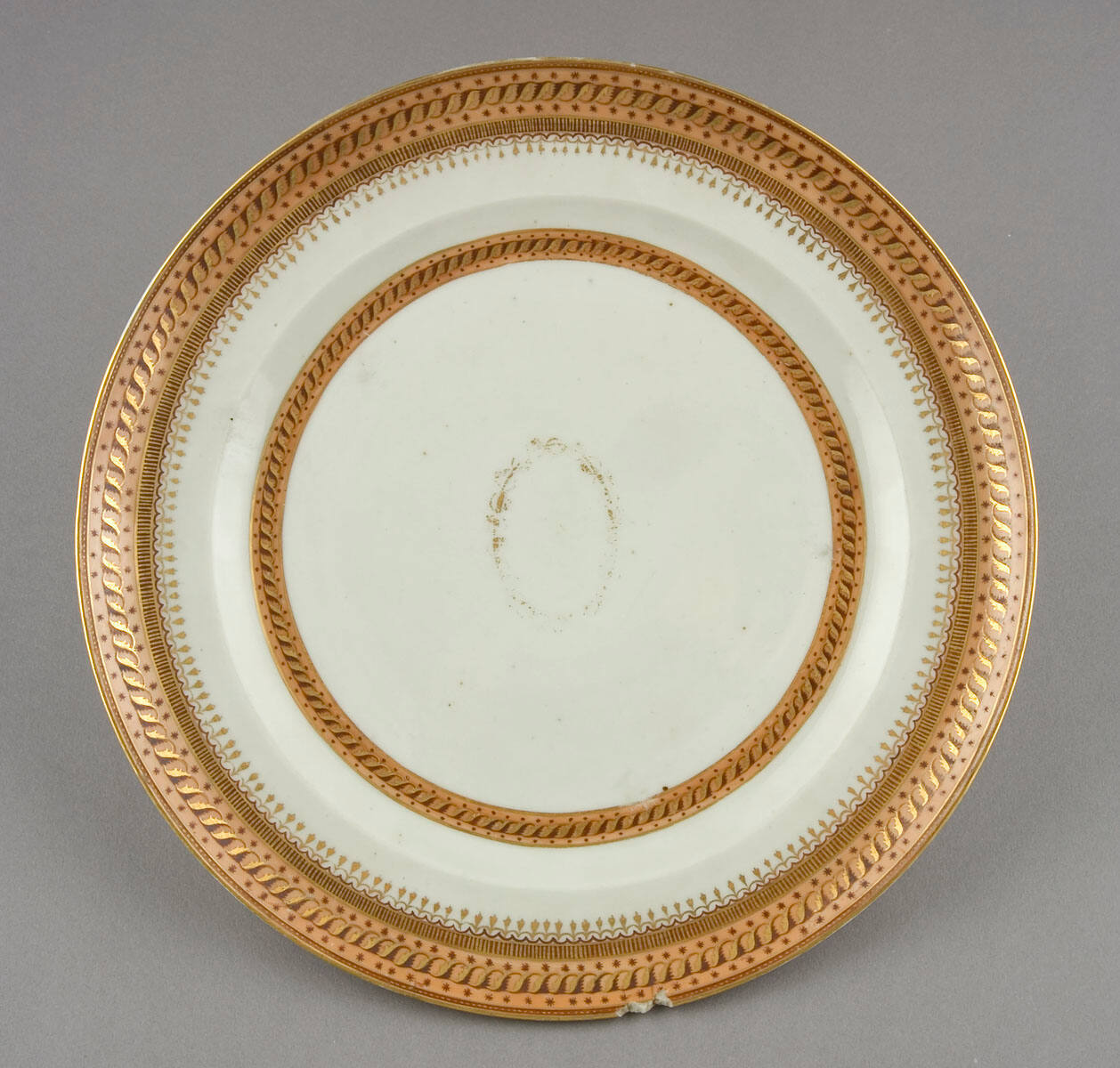 DescriptionOrange and sepia borders. Oval medallion with initials erased.