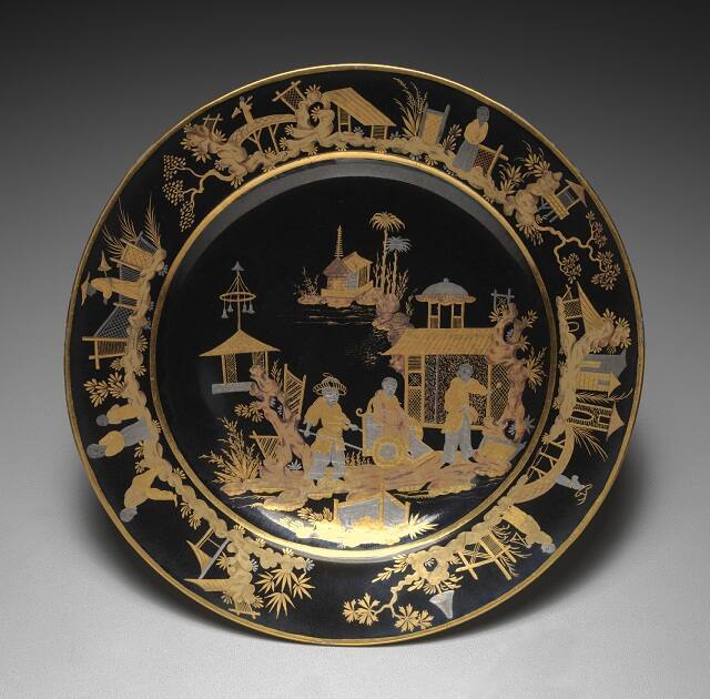 DescriptionBlack porcelain decorated with gold and silver Chinoiserie design, man riding in chair, two servants, landscape.Gallery LabelThis plate and cup and saucer reflect the influence of Asian styles on European decorative arts; fanciful pagodas, exotic chinoiserie figures and rich gilding imitate Chinese and Japanese lacquer wares. The decoration of a solid color with gold and platinum was uncommon at Sèvres, apparently first used on a service ordered by the French queen Marie Antoinette in 1789. Both the red and black grounds are rare, with red being the rarest of Sèvres ground colors.