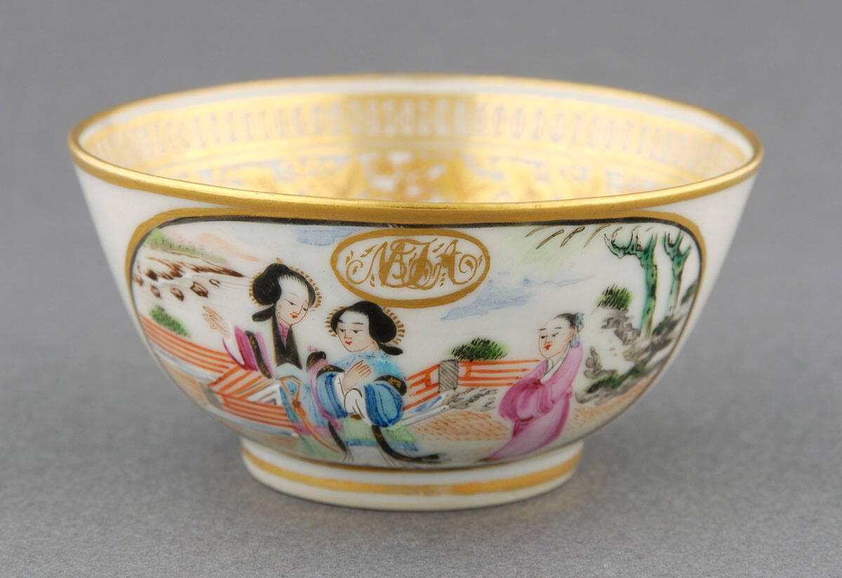DescriptionPart of seventy-seven piece tea and coffee service. In bottom of saucer and on interior sides of cups is a scene painted in Famille rose style showing two Chinese ladies and attendent in garden. Above figs is gold monogram, MTA, in gold oval. On interior sides of all pieces is border design in gold of grape bunches and leaves. On handleless cups on exterior side is also a gold spray of leaves and berries.