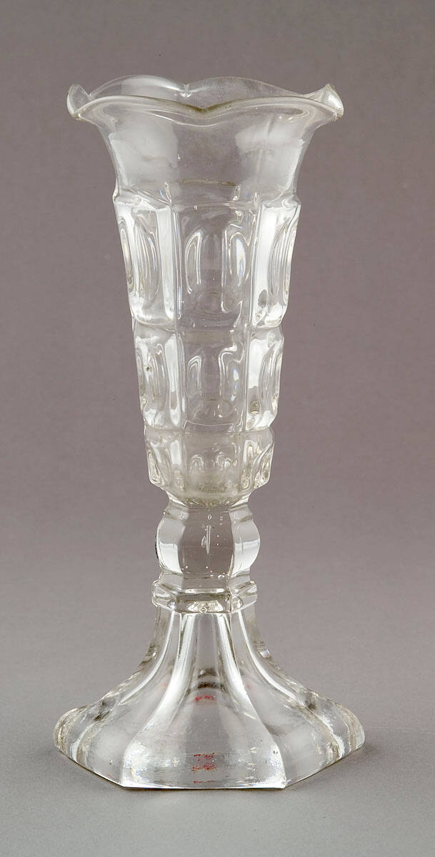 DescriptionThree block; hexagonal pattern on bowl with ruffled rim, hexagonal knob shank, and flaring hexagonal base.