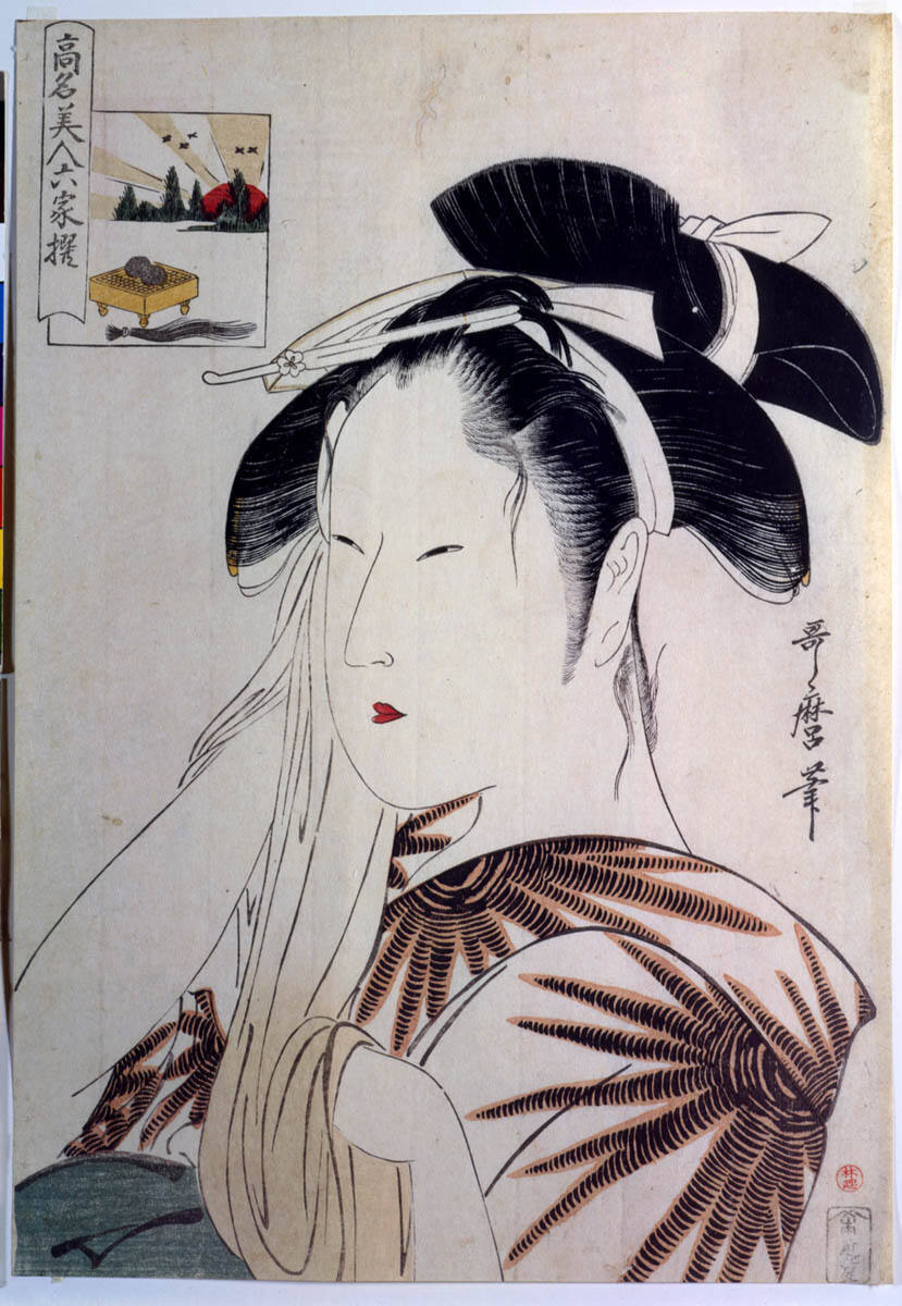 An important artist of Ukyio-e, Kitagawa Utamaro was celebrated for his images of beautiful women, both geisha (courtesan) and ordinary women. His favorites are these sensual, slender beauties engaging in everyday activities.