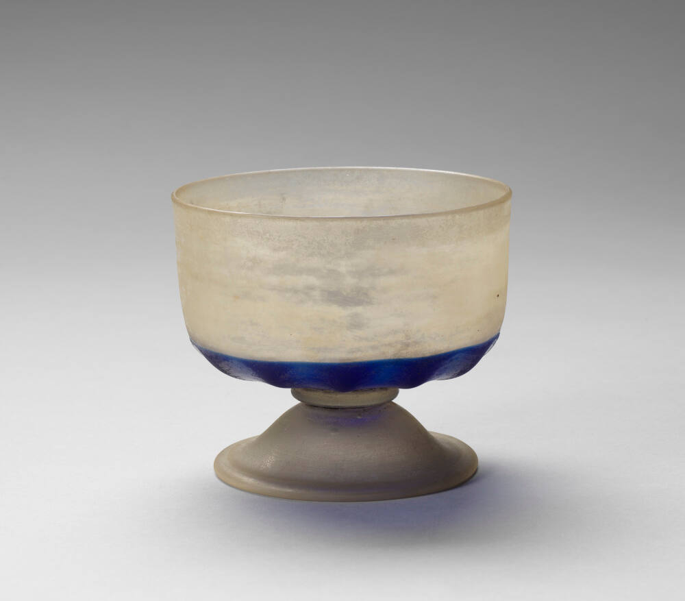 DescriptionCylindrical bowl, fairly thick. Colorless, originally transparent glass (now whitish from decomposition) fused onto a bottom of dark blue glass shaped in twelve lobes, and the whole mounted on a two part foot consisting of a ring of transparent, colorless glass and a flaring circular foot with a double rim formed by turning the glass under at the edge.