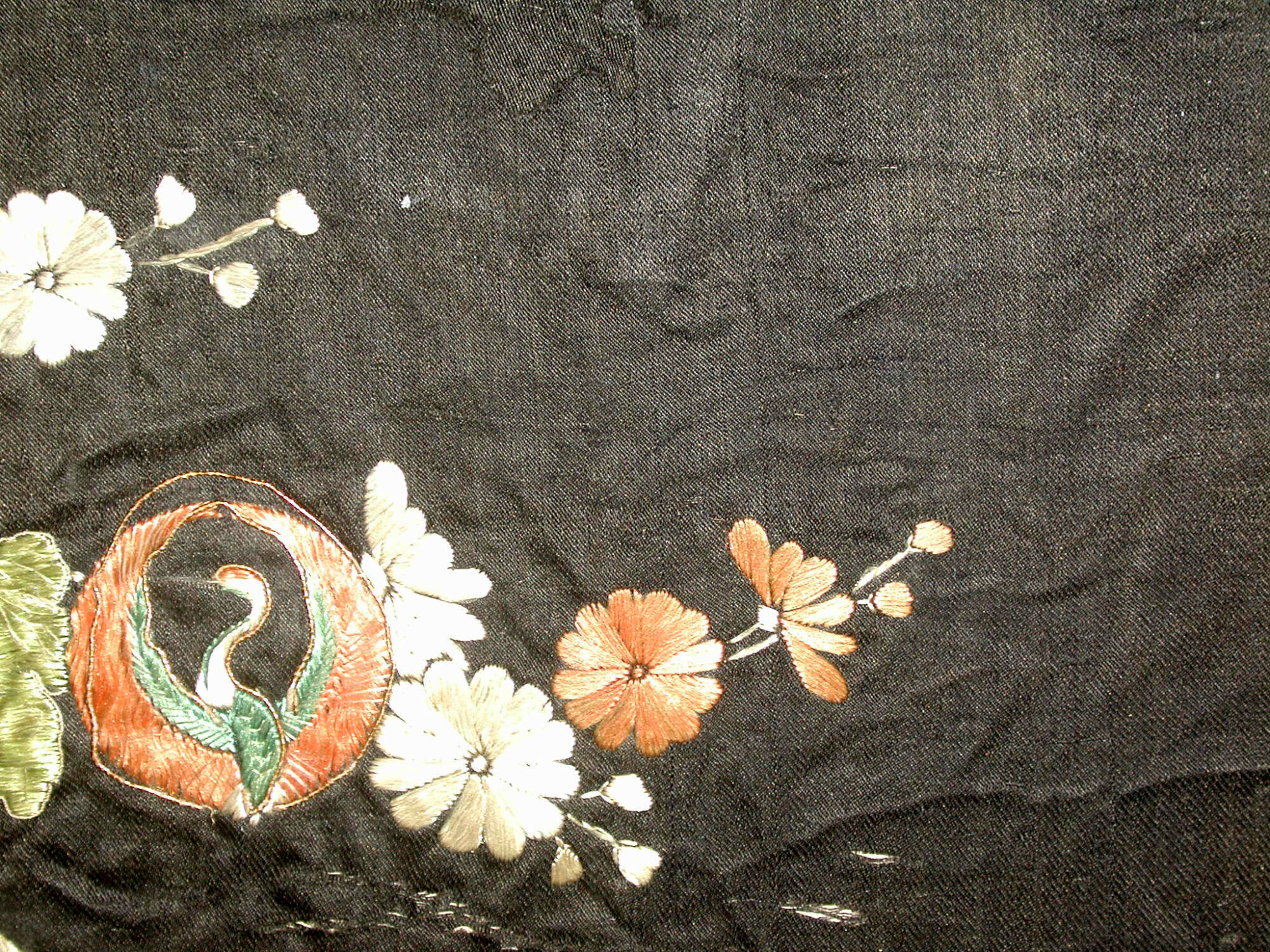 DescriptionDark brown background, sprays of flowers and storke in green, blue, white, and gold thread.